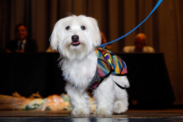 Partiamo dal fatto che vestire dei cani è un esempio d’idiozia, i cani stanno bene come Dio li ha fatti, farli fare una sfilata di moda poi… Ma la nostra società ci ha abituato a queste cazzate. |