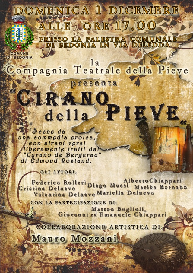 Una scalcagnata compagnia teatrale vuol mettere in scena il “Cyrano di Bergerac” ma mentre si appresta a fare le ultime prove si accorge di essersi sbagliata: il pubblico è arrivato in anticipo ed è già in sala. Questo è l’inizio del “Cirano della Pieve” trasposizione, a tratti irriverente, del capolavoro di Rostand creata dalla “Compagnia della Pieve” di Bedonia. Attraverso la rivisitazione delle scene più importanti, gli attori, mescolando i ruoli, riusciranno tutto sommato a raccontare con completezza la storia del “nasone” di Bergerac e a renderla a tratti comica, a tratti ironica e, infine, commovente.