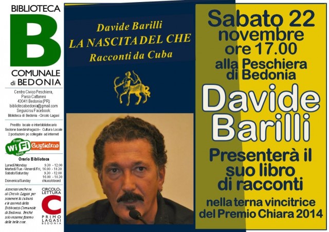 Sabato pomeriggio alle 17 al Centro civico Peschiera Davide Barilli, finalista al premio "Piero Chiara del 2014, presenterà i suoi racconti raccolti nel volume "La nascita del Che". La povertà, la gioia, la malinconia e l'amore di e per Cuba e per la sua gente, raccontati con grande maestria e grande passione per la grande isola Caraibica.