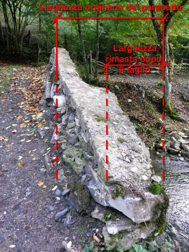 I solidi parapetti in pietra sono stati dimezzati in spessore (per tutta la lunghezza del ponte), probabilmente tagliati con flessibile, per allargare la sede del ponte e consentirne quindi il passaggio di mezzi di trasporto più larghi.