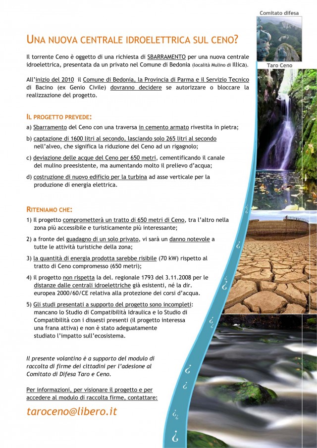 Come da altro argomento del forum, annunciamo la raccolta di firme in opposizione al progetto di sbarramento del Ceno e costruzione di nuova centrale idroelettrica in località Mulino di Illica (Bedonia) e la costituzione del "Comitato Difesa Taro e Ceno".