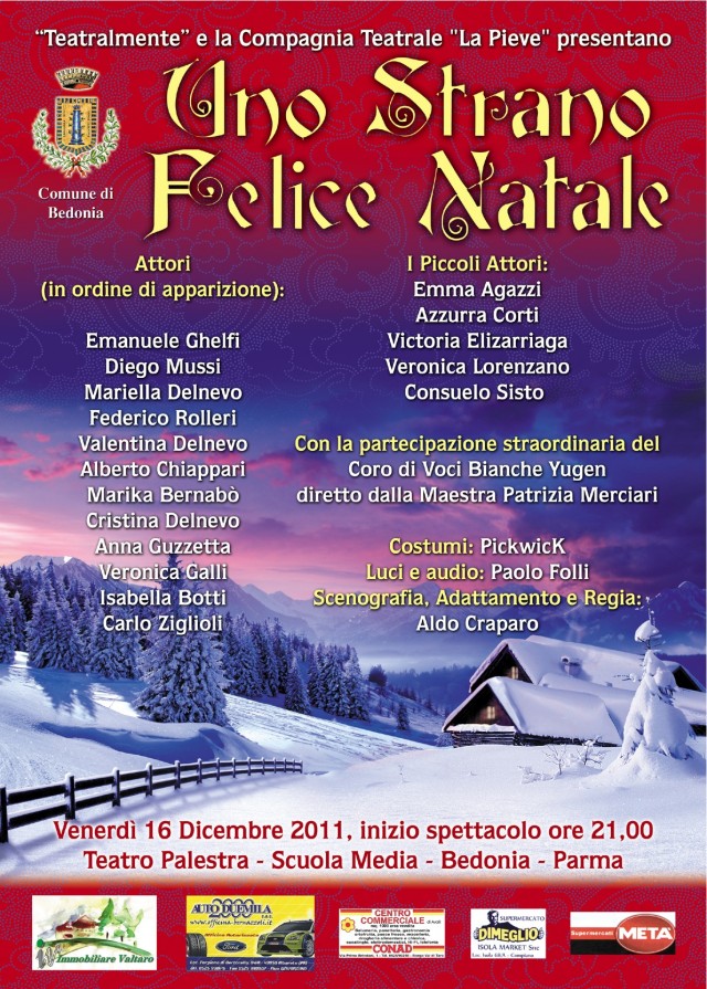 Uno Strano felice Natale è il titolo dello spettacolo che vedrà debuttare sulle scene, venerdi prossimo 16 Dicembre, la nuovissima Compagnia Teatrale della Pieve, creata dai partecipanti al progetto"Teatralmente", i laboratori di tecnica teatrale promossi a Bedonia dall'attore e regista Aldo Craparo.